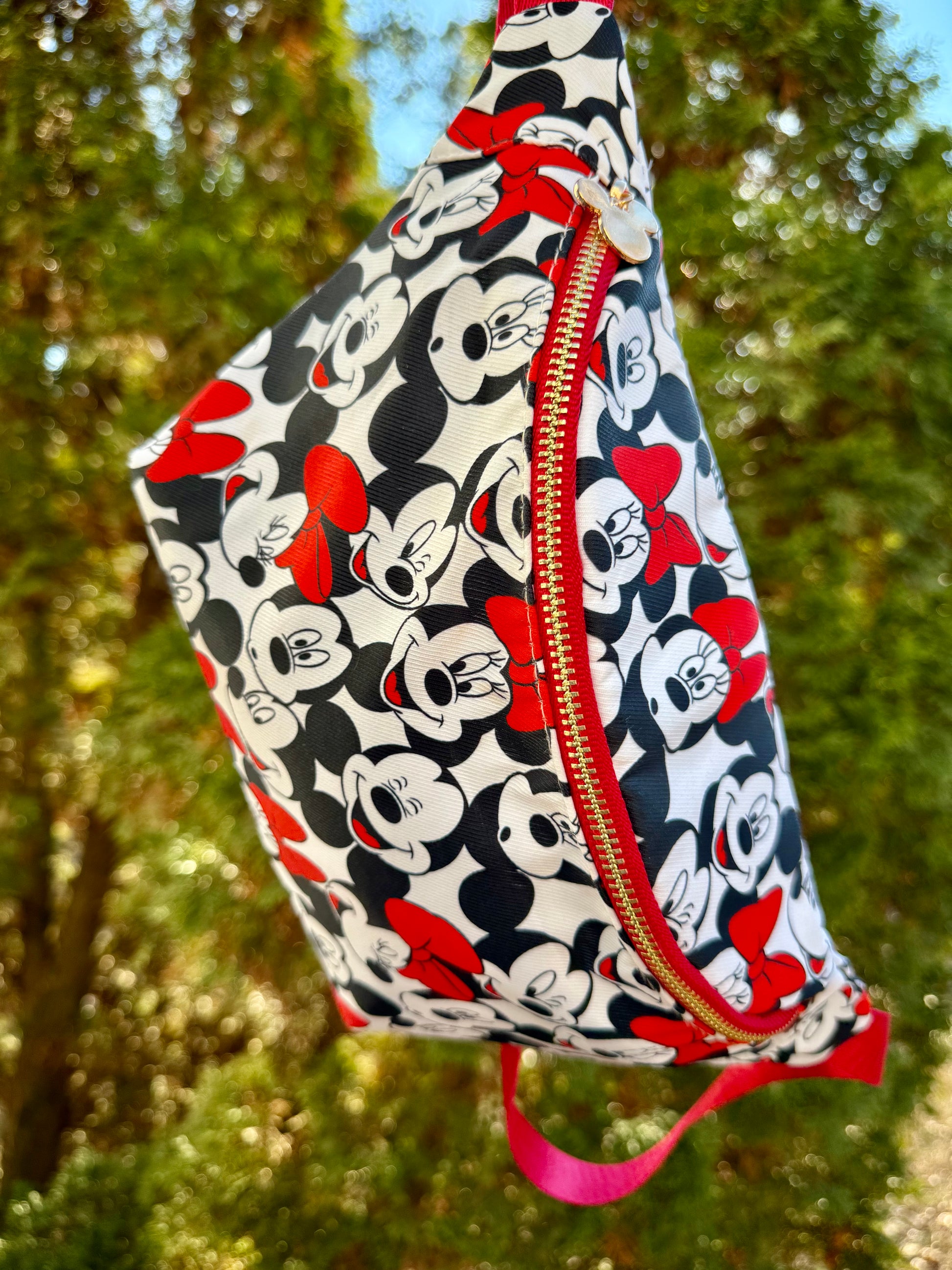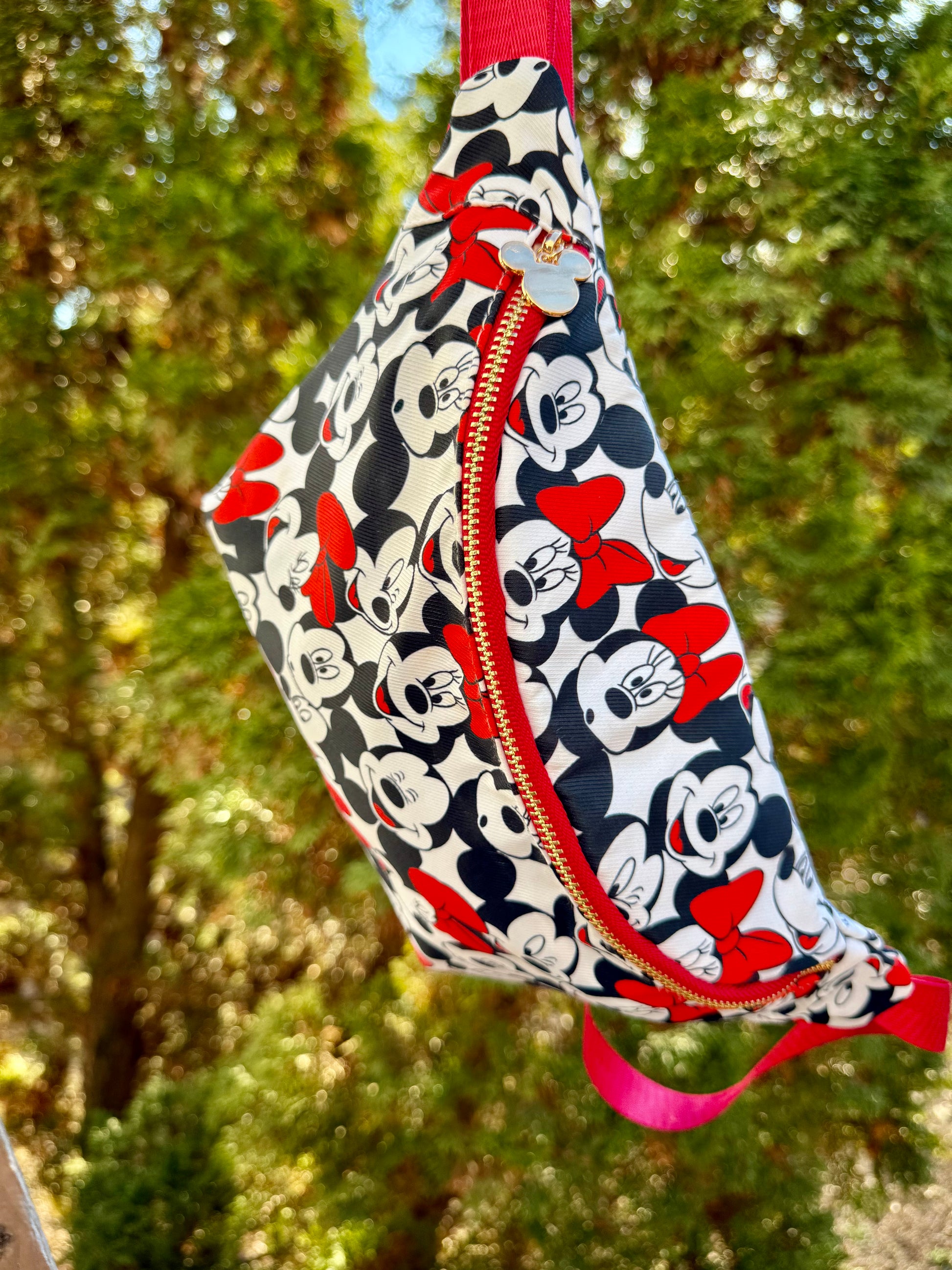 Introducing the Classic Magical Duo Fanny Bag! This bag is perfect for a day at the park (or any day) and features an iconic black, white design of everyone's favorite mouse duo with some pops of red throughout. With plenty of space and a playful design, this fanny pack will add a touch of magic to any outfit.