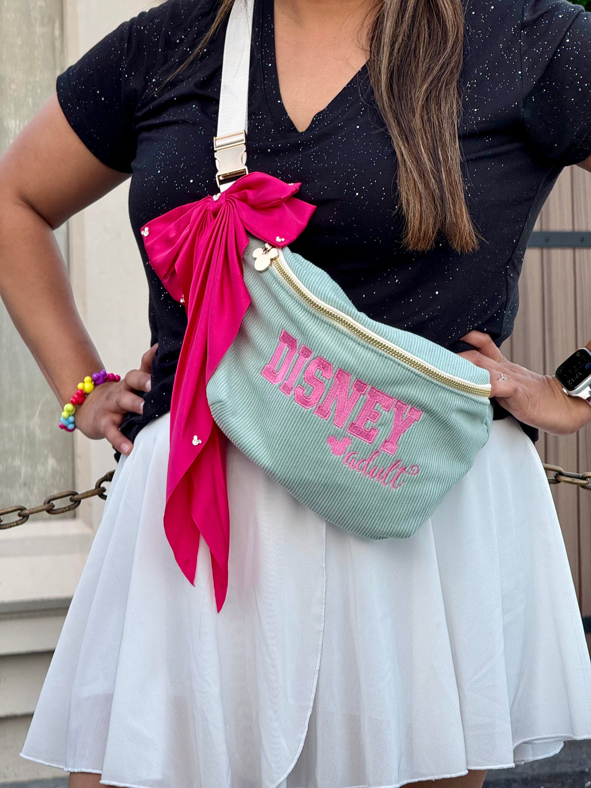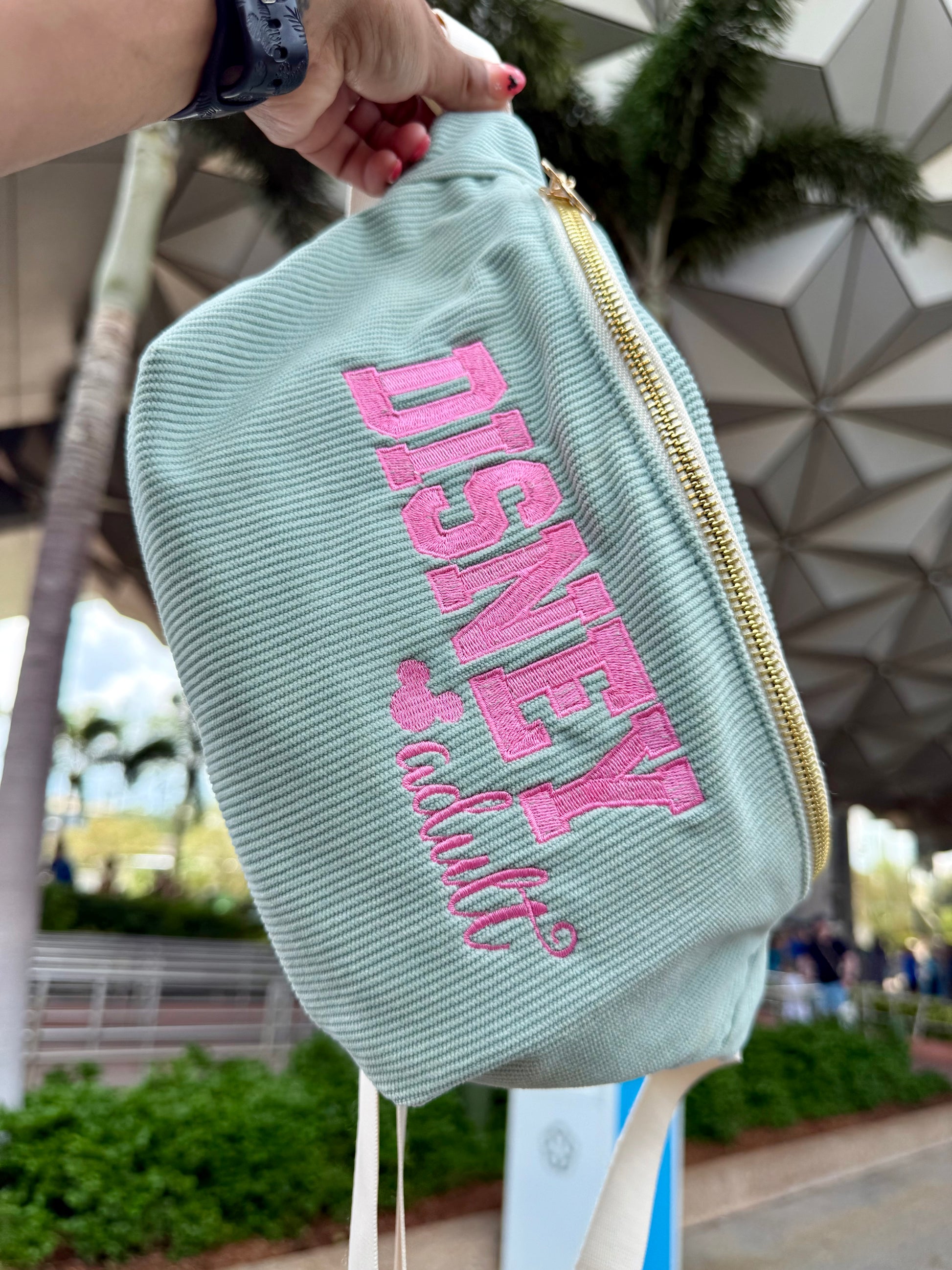 This light blue pastel corduroy fanny bag embodies a perfect blend of sophistication and charm. This bag features just the right amount of whimsy thats ideal for any adult that wants to show off their love for the magical parks!