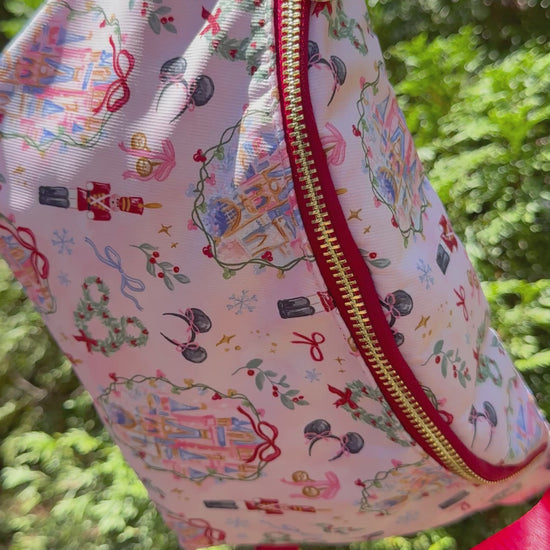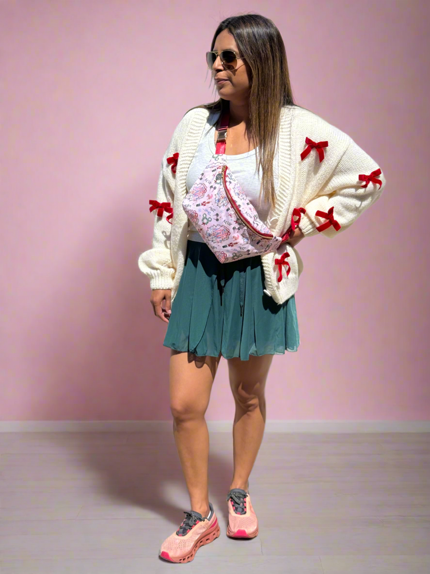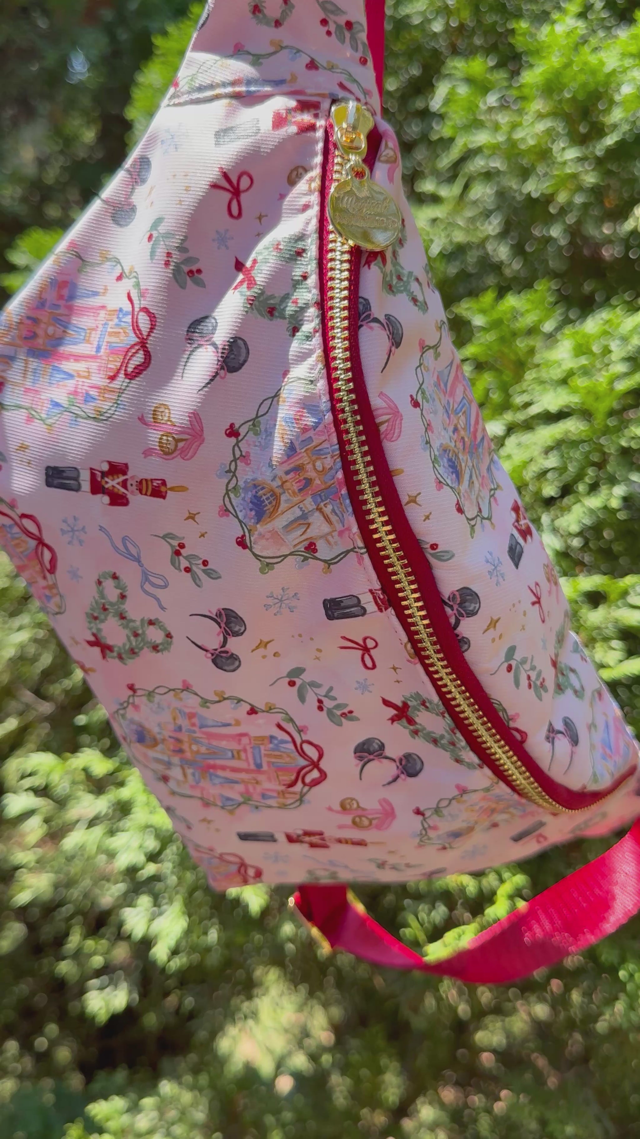 Celebrate the season in style with our Coquette Christmas Fanny 🎀✨. Featuring a pink holiday print of castles, nutcrackers, bows, and wreaths, this nylon bag is both magical and practical
