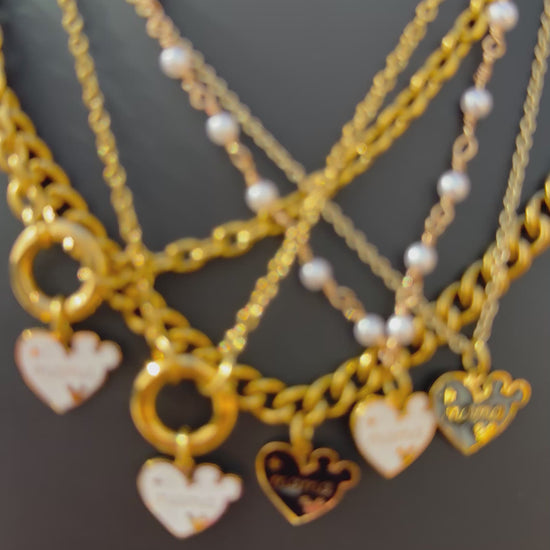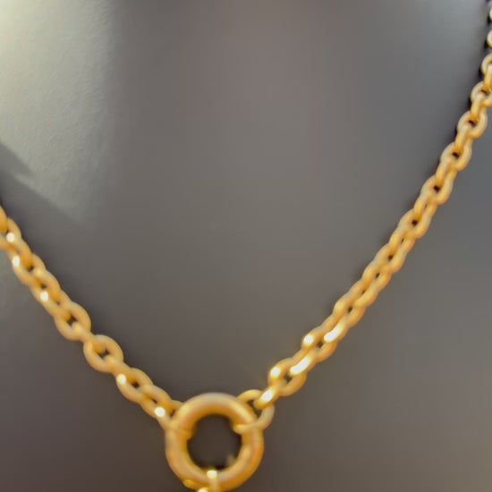 A. 16” curb chain with a 2” extender, crafted in 18k gold-plated stainless steel. Features a 14mm circle hinge clasp for easy on-and-off wear and effortless charm adding