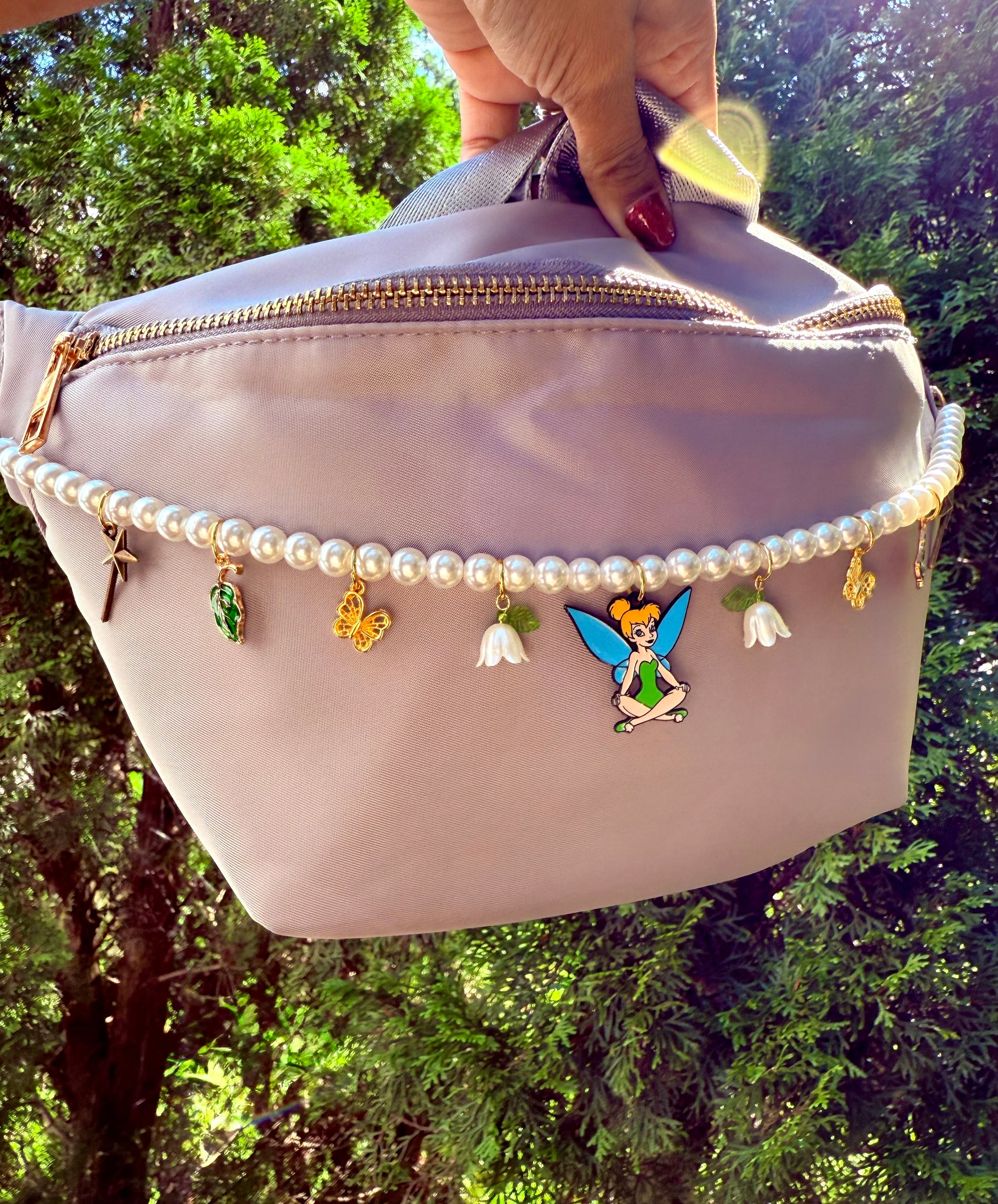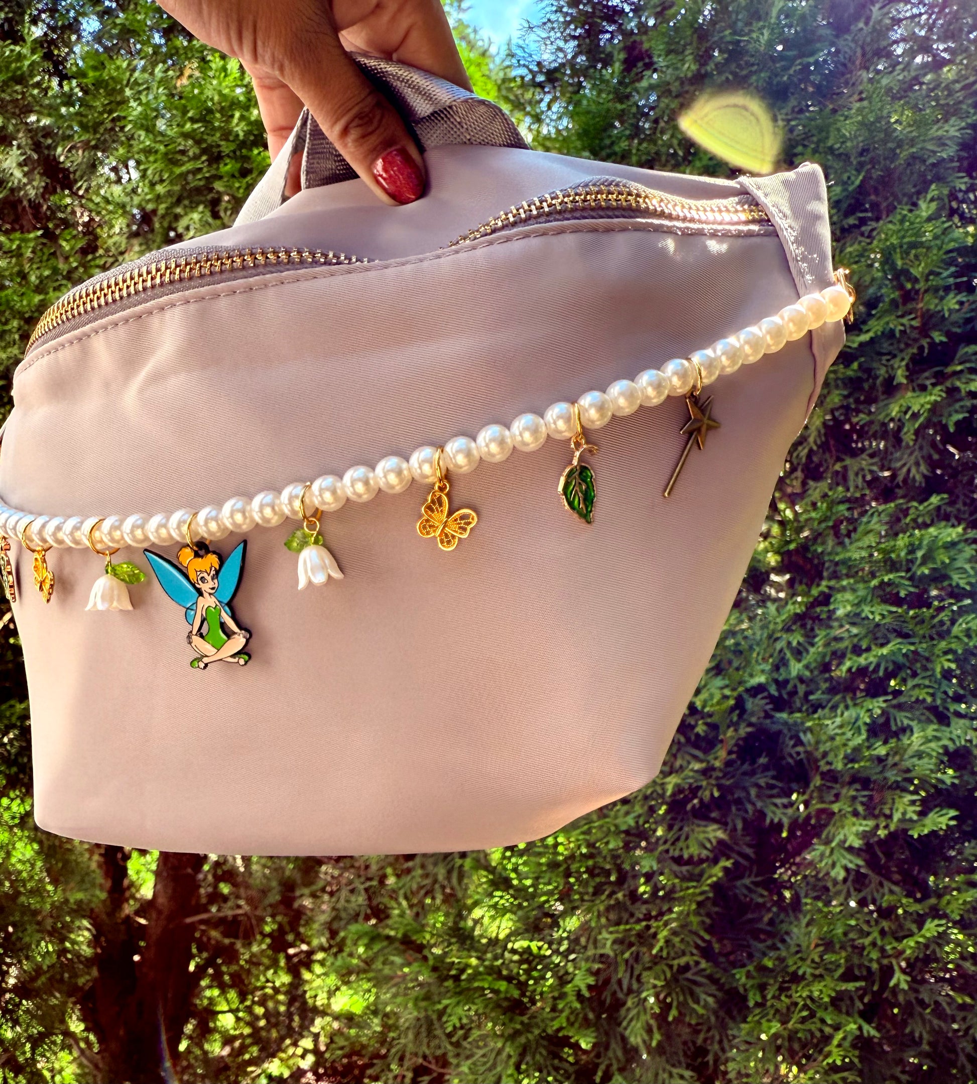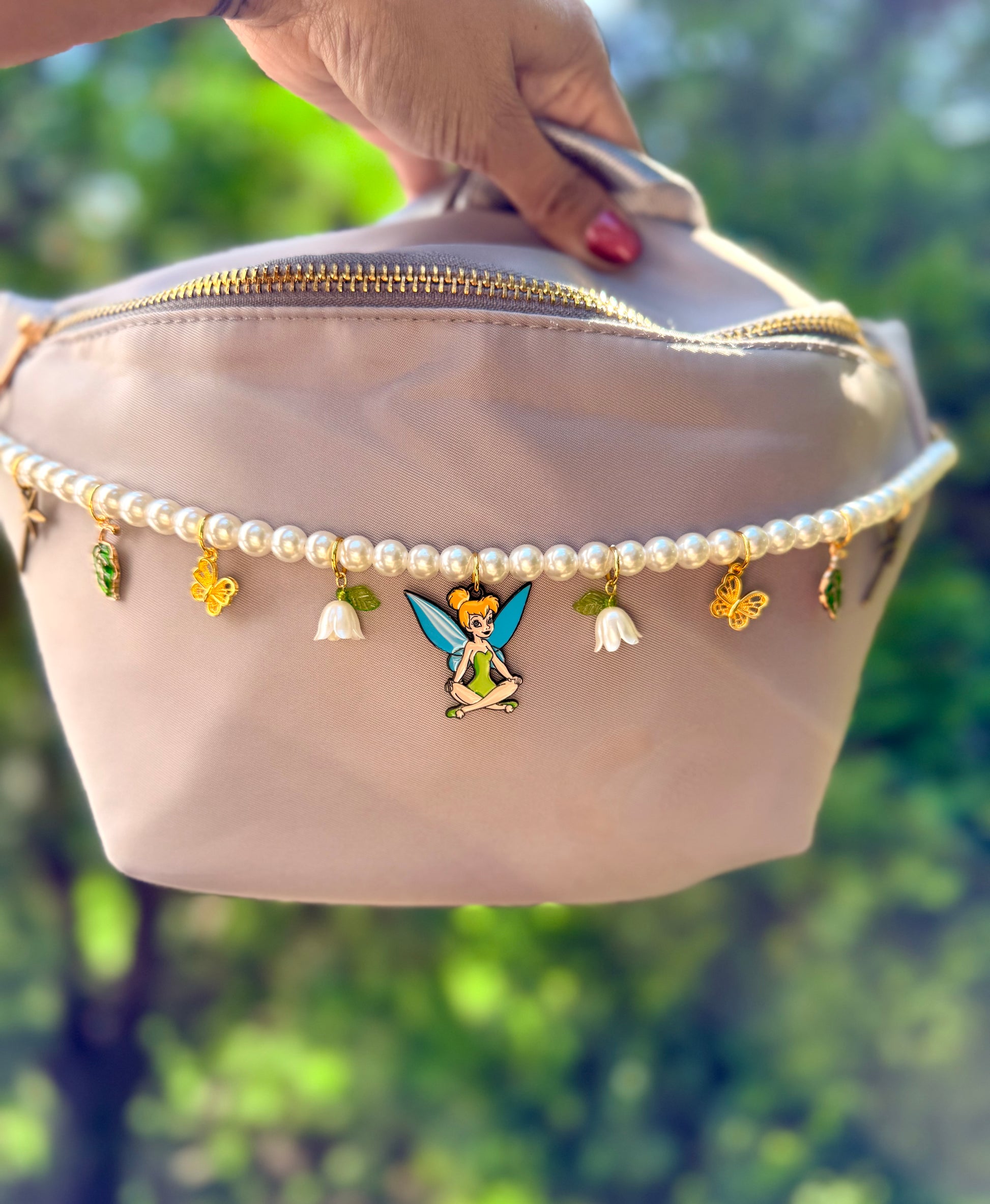 This is or whimsical bag chain inspired by Tinker Bell’s sparkle and charm. Featuring luminous faux pearls adorned with enchanting charms—delicate butterflies, blooming lilies, and a playful fairy centerpiece—this chain brings a sprinkle of pixie dust to every park day adventure. Perfect for adding a touch of magic and elegance to your bag, it’s a dreamy blend of fairy-tale charm and timeless pearl beauty.