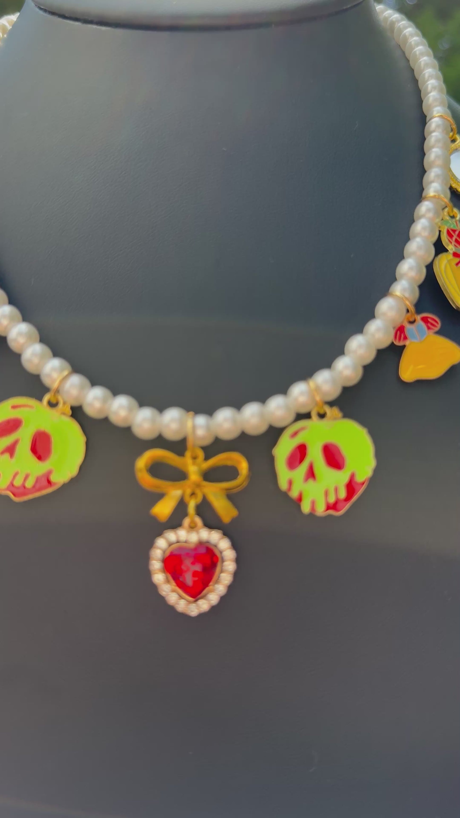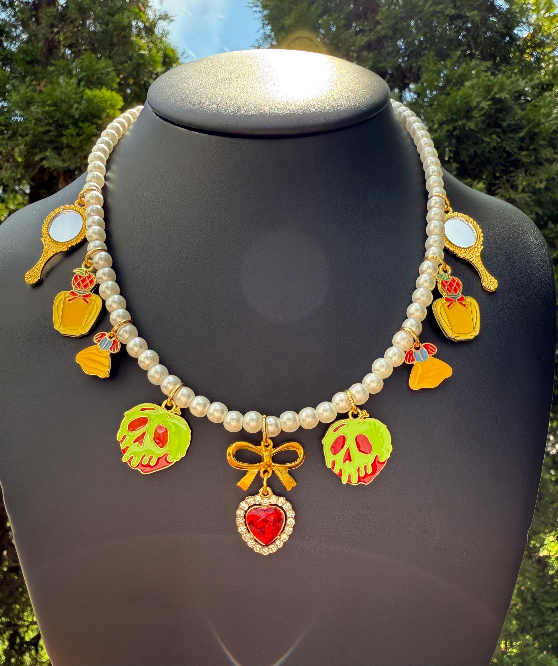 Step into a fairytale with our Poisoned Beauty Necklace, a spellbinding piece inspired by your favorite timeless tale. Strung with luminous faux pearls, this necklace drips with enchanted charms that capture the story’s most iconic moments—glistening poison apples, golden mirrors, dainty bows, and a dazzling heart centerpiece that sparkles with forbidden allure.
