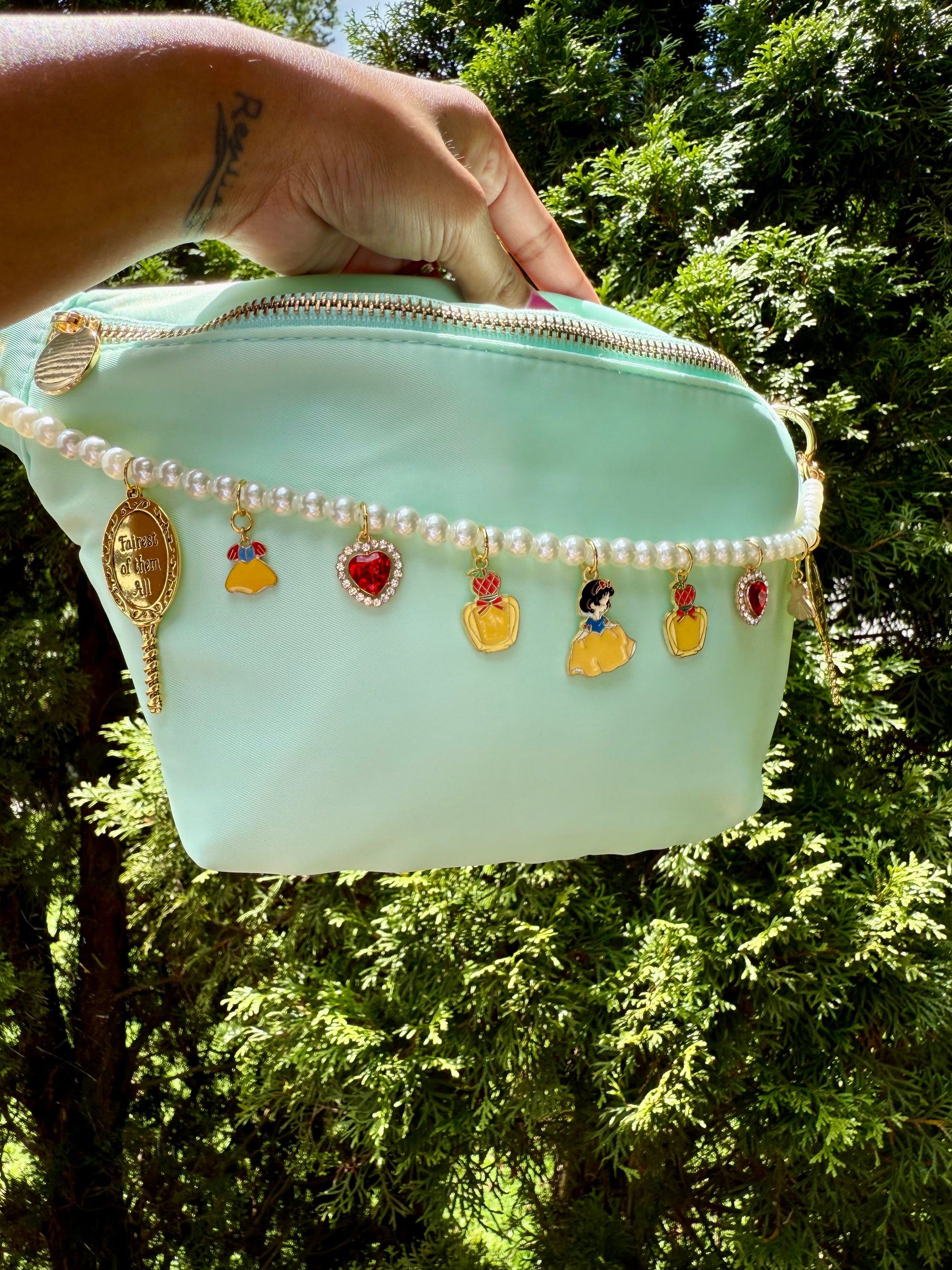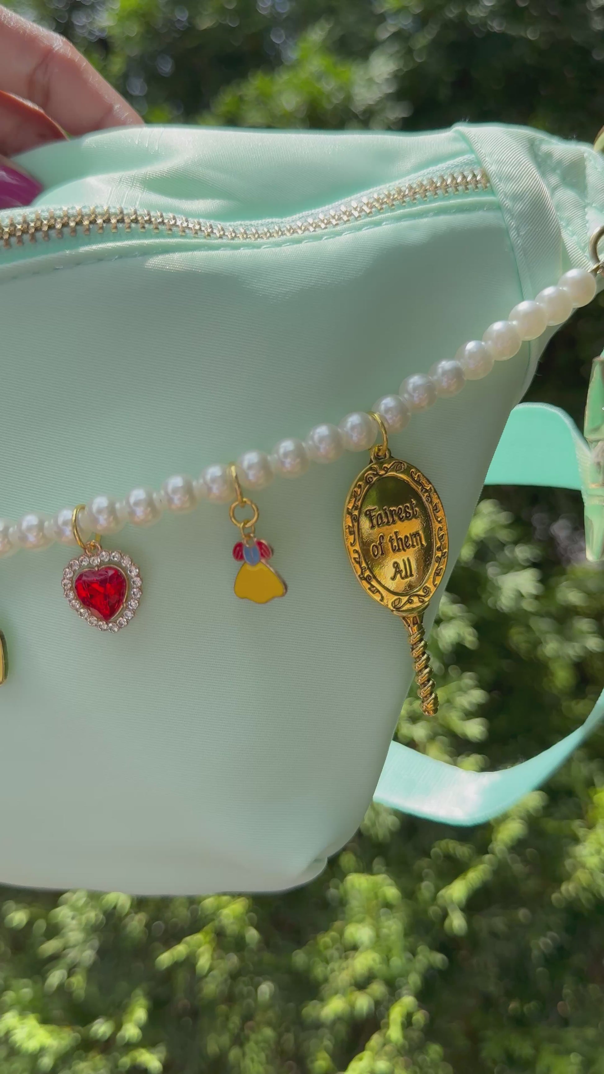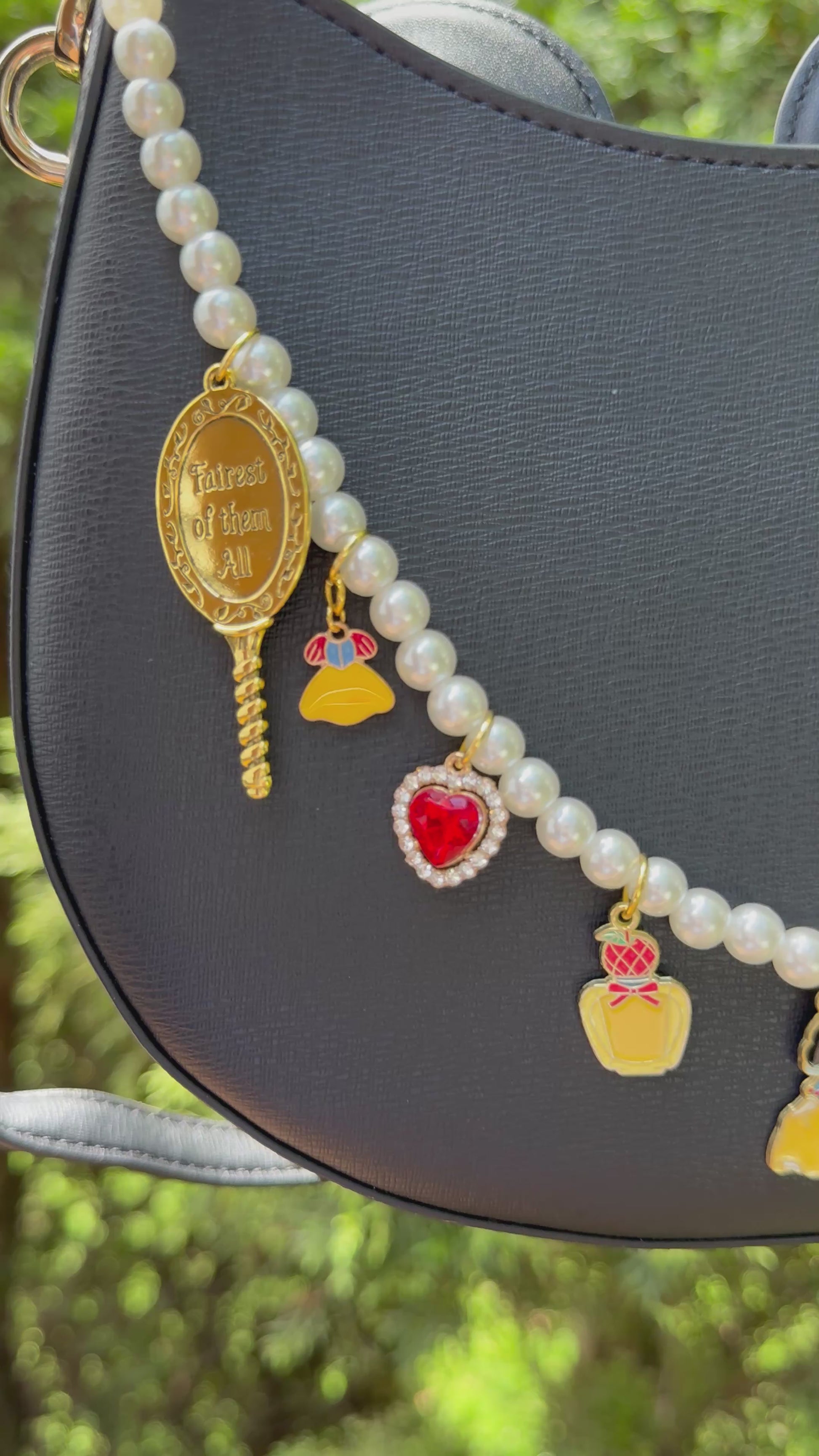 Elevate your bag game with The Fairest Bag Chain. Featuring dainty pearls, ruby red hearts, and a sprinkle of charm inspired by the fairest of them all.
