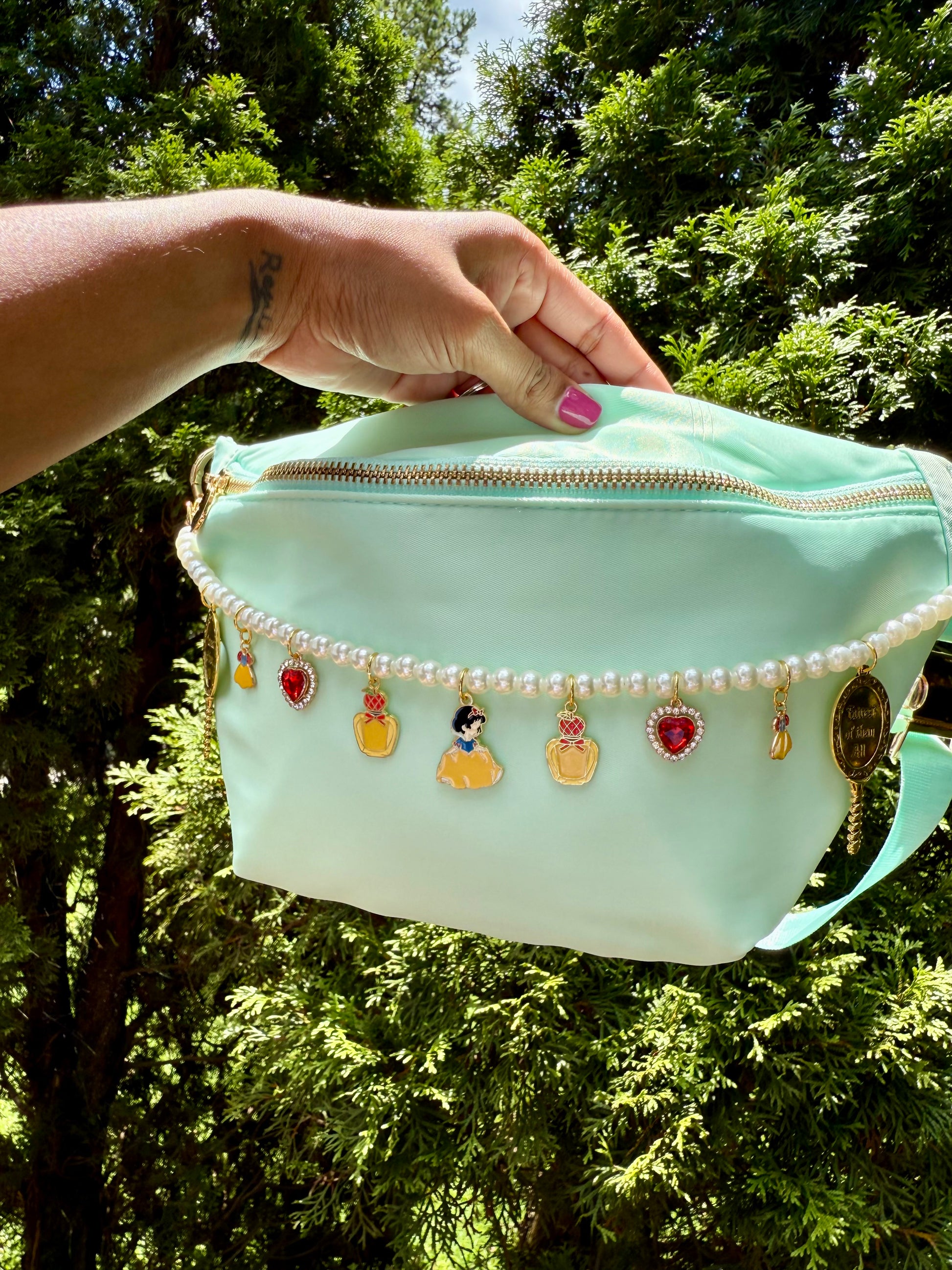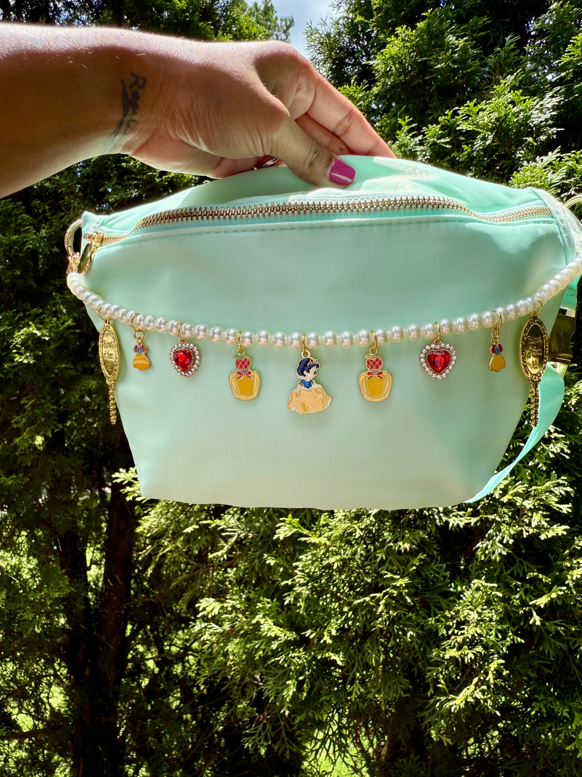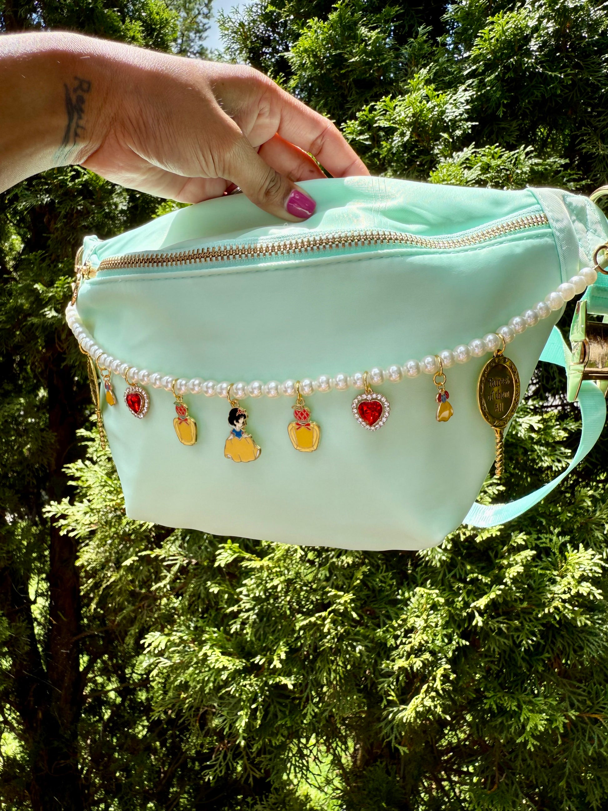 Elevate your bag game with The Fairest Bag Chain. Featuring dainty pearls, ruby red hearts, and a sprinkle of charm inspired by the fairest of them all.
