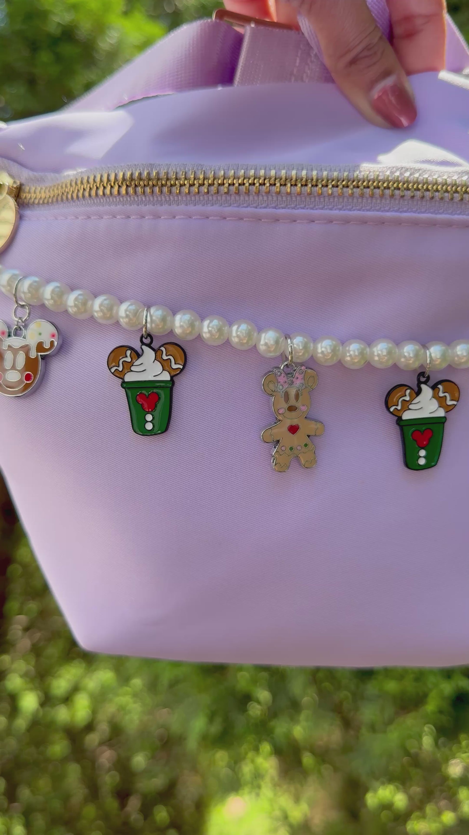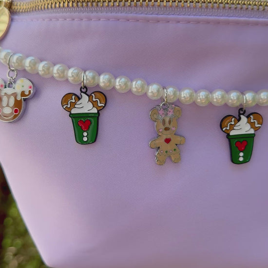 Baked with Magic is a charming holiday bag chain adorned with your favorite gingerbread mouse pals, festive cocoa, and candy-sweet details-all strung along soft pearls. It's the perfect sprinkle of cozy nostalgia to complete your holiday looks during winter park days.