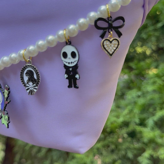 Add a touch of spooky romance to your Halloween ensemble with the Forever Fright Bag Chain. This perfectly haunting accessory features the dark soulmates whose love bloomed in the shadows, making it the perfect addition to your Halloween season wardrobe.